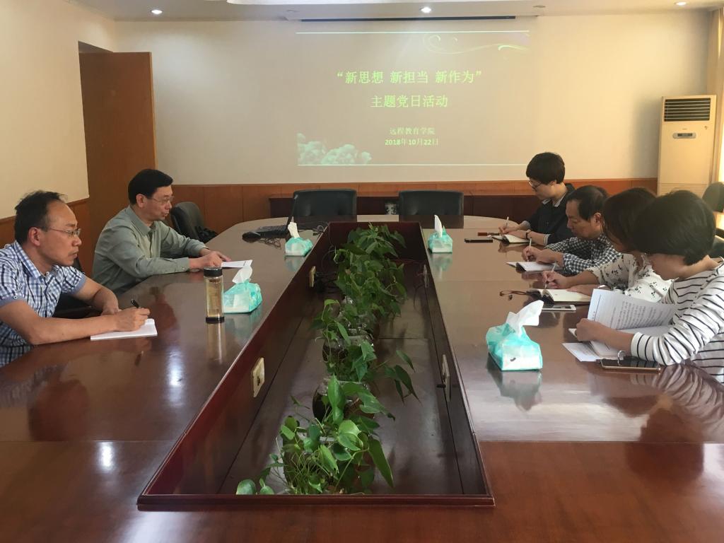 为深入学习贯彻习近平新时代中国特色社会主义思想和党的十九大精神,严肃党内政治生活,充分发挥基层党组织战斗堡垒和党员先锋模范作用,10月22日下午,远教学院党支部开展主题党日活动。活动以“新思想新担当新作为”为主题,以集体学习,党员代表主讲的形式开展。