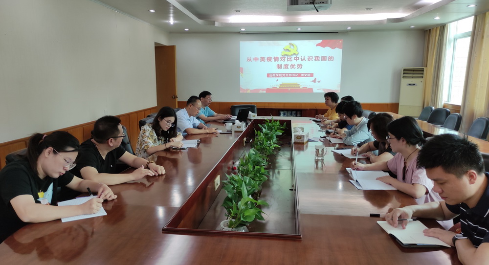 周文明以《从中美疫情对比中认识我国的制度优势》为题,结合自己对中国制度的理解,从中美抗击新冠肺炎疫情现状对比、反差原因分析和反差带来的启示三个方面生动翔实的比较了疫情下两国制度。他指出,在学校党委的坚强领导下,学院要把师生生命安全和身体健康放在第一位,立足常态化疫情防控,统筹推进常态化疫情防控条件下的各项教育教学工作,特别是要做好近期的全省网络教育统考工作,不断巩固和拓展疫情防控成效。