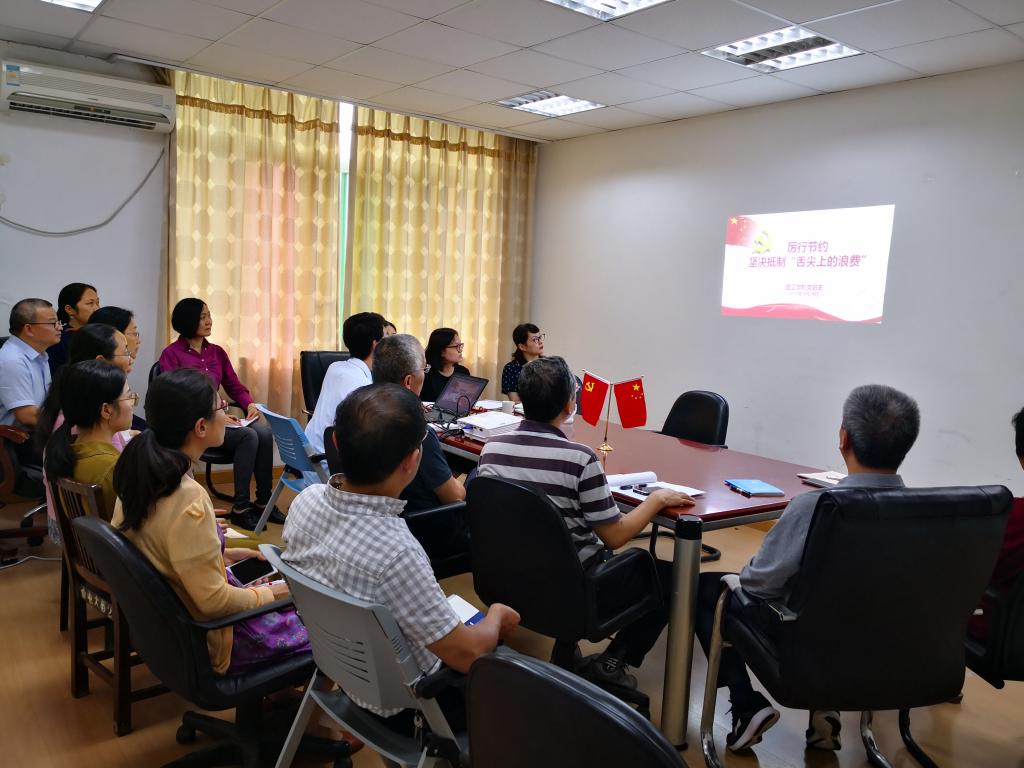 “一粥一饭,当思来处不易;半丝半缕,恒念物力维艰。”勤俭节约、艰苦奋斗历来是中华民族的传统美德,也是我们党的优良传统。为贯彻落实习近平总书记关于“坚决制止餐饮浪费行为”的重要指示精神,推动形成“厉行节约、反对浪费”的良好社会风尚,引导理工学院教职工牢固树立“节约光荣、浪费可耻”的意识,9月24日下午,理工学院党总支开展了“厉行节约,坚决抵制‘舌尖上的浪费’”主题党日活动,活动由党总支书记雷乃旺主持,学院全体党员参加。
