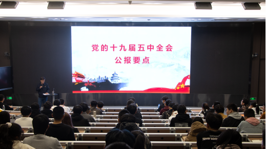 吴宁晖从“十九届五中全会概况”“十九届五中全会公报解读”“到二〇三五年基本实现社会主义现代化远景目标”“‘十四五’时期经济社会发展必须遵循的原则”等方面,以翔实的数据、深入浅出的语言对全会精神进行了解读。结合学院实际,重点就十九届五中全会对经济发展、高等教育的新要求进行了详细的讲述,引导与会人员用全会精神指导开展学院当前工作,引领、规划学院事业发展。他要求,青年学生要从点滴做起,认真学习、不懈奋斗,为夺取全面建设社会主义现代化国家新胜利贡献青春力量。