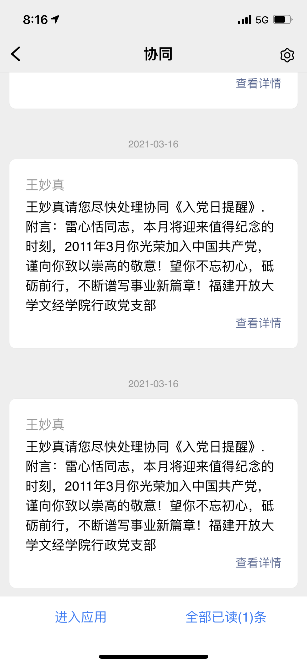 收到入党日提醒的党员既意外又激动,他们表示要倍加珍惜自己的党员身份,把自己的一言一行与党的事业联系起来,用一生的行动来践行入党誓言,坚持为党育人、为国育才,争当“四个引路人”“四有好老师”,以实实在在的奋斗守好初心、担好使命,为福建开放大学建设添砖加瓦。