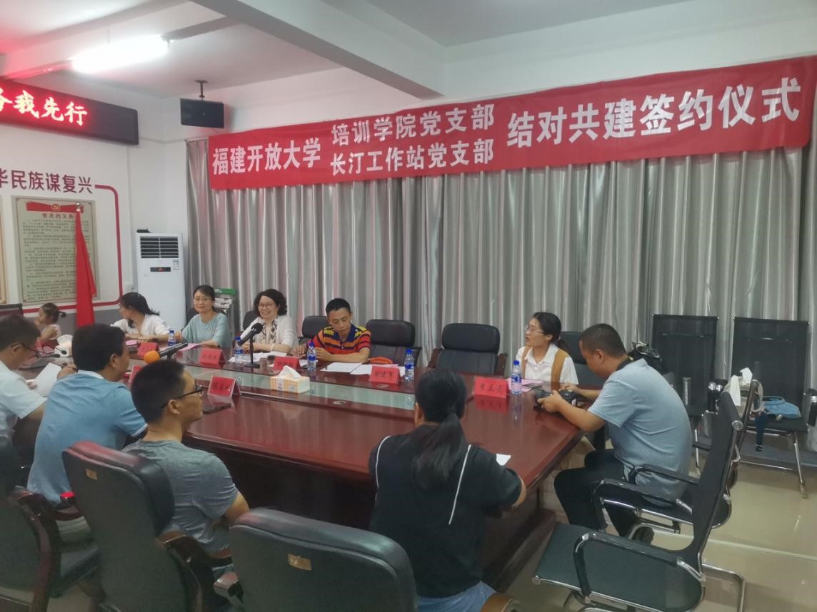 在支部立项活动中,首先由长汀工作站党支部书记肖贞祥详实、系统地介绍了长汀电大工作站的发展历程及长汀在中国革命史、党的建设中的区位定位,重点介绍了近5年来长汀电大在党支部的带领下,基层电大人践行“服务无止境,支撑零距离”服务理念,由一个400多个学生的小站发展成为2200多学员的“学历教育惠民服务中心”的初心历程。培训学院党支部组织委员欧雅洪表示为进一步落实学校基层党组织共建联创机制,激发党建队伍活力,本着“资源共享、优势互补、共同发展”的理念,希望通过开展“红色1+1”结对共建活动,结成共谋发展合作团队,寻求服务师生新途径,提高学历教育+非学历教育办学新水平,实现“双赢”新局。最后,由双方支部书记代表福建开放大学培训学院党支部与长汀电大工作站党支部签订《“红色1+1”活动结对共建协议书》。