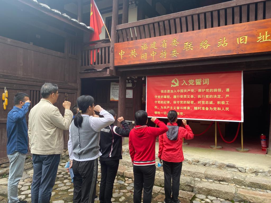上午,全体人员抵达永泰老区革命基点村——赤水村。抗日战争时期,中共福建省委、闽中特委在此设立地下秘密联络站。她为福建省委、闽中特委在德化坂里、永泰东湖和塘前官烈等地开展抗日斗争、反顾自卫及解放战争时期开展爱国游击斗争,为民族独立和人民解放做出了积极贡献,谱写了一曲曲可歌可泣的壮丽篇章。在中共福建省委(闽中特委)联络站纪念馆内,全体人员认真参观并聆听了当年闽中游击队如何开展革命斗争——中共闽中特委领导人黄国璋、林汝楠、中共永泰县委领导人饶云山、郭永星、联络站地下交通员黄声烟、林爱菊夫妇等英勇无畏的历史故事,开展了一次深刻的红色实地教育,接受了革命精神的洗礼;在工会科研党支部书记张玲的带领下,全体党员一起再次重温入党誓词。