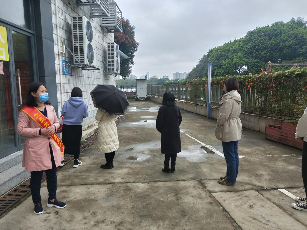 党员志愿者引导教职工按一米线排队