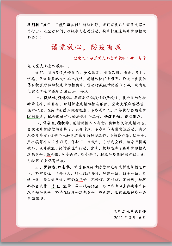 微光成炬,共克时艰。电气工程系党支部将持续引导支部全体教职工亮身份、见行动、作贡献,共筑防疫屏障,用团结、责任和担当,守卫好校园的一方净土和蓝天!