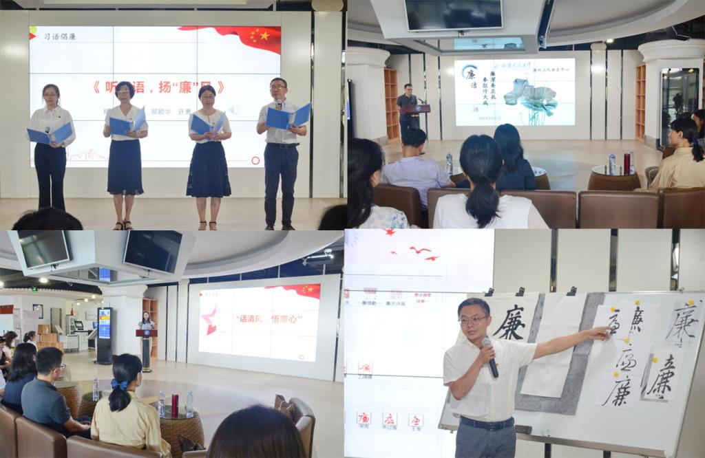 活动以“扬清风,守廉心”为分主题,围绕“习语倡廉”“教育警廉”“行动守廉”三个篇章展开。“习语倡廉”篇,通过《听习语,扬清风》朗诵节目,以诗词咏廉、颂廉的方式回顾习近平总书记关于“廉政”的相关重要论述,传递崇廉尚廉正能量。“教育警廉”篇,观看了学校拍摄的茶廉主题微视频《草木之间,廉刻心中》,以茶风茶韵中的廉文化,熏陶党员廉政之风;纪检监察室副处长蔡亮光从纪法宣讲入手,以《酒驾与代价》为题,以案说廉,用生动形象的微课让廉洁自律意识深入人心,引导大家进一步增强纪法意识、筑牢思想防线。“行动守廉”篇,文经学院青年教师梁晨围绕“话清风,悟廉心”,从习近平总书记对青年干部的要求出发,分享交流对廉洁的认识和自勉。2022春书法专业学生宋驰为大家讲解“廉”的释义并现场书写“廉”字,邀请部分党员执笔临摹,通过写“廉”入心,让现场党员感受“廉”字的起承转合,体会“心正则笔正”的廉义清风。