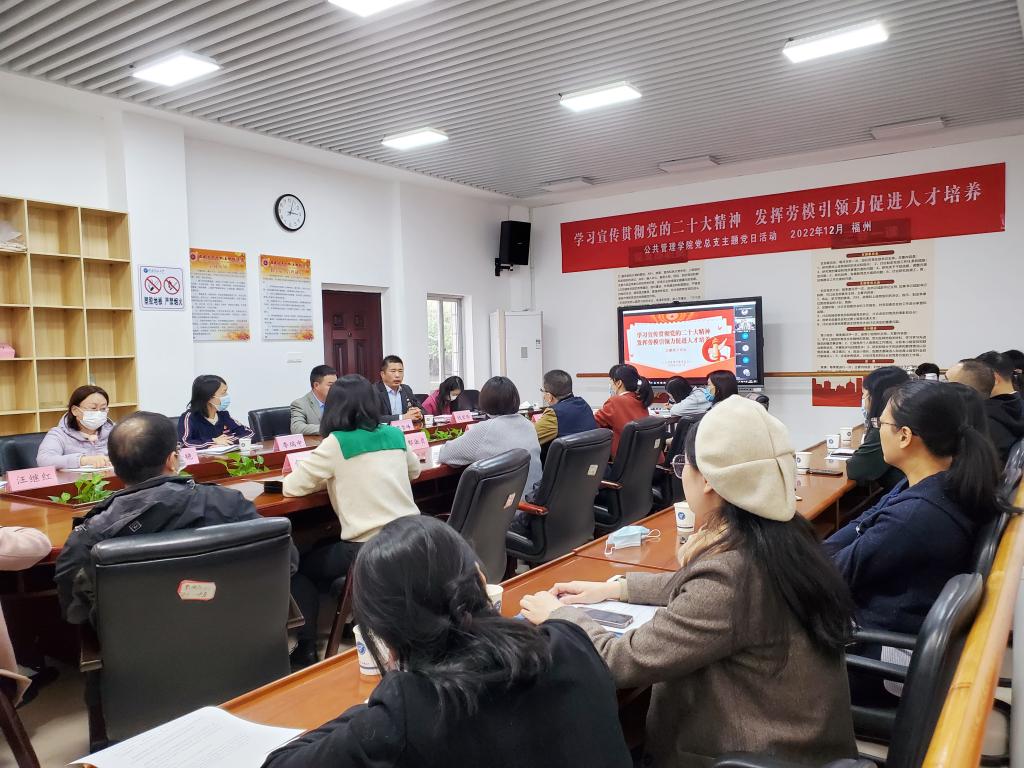 为推动学习宣传贯彻党的二十大精神走深走实走心,弘扬劳模精神、劳动精神、工匠精神,为谱写新时代学院建设发展新篇章凝聚力量,按照学校党委统一安排,12月1日下午,公共管理学院开展“学习宣传贯彻党的二十大精神,发挥劳模引领力促进人才培养”主题党日活动。活动由党总支副书记、党政管理党支部书记、学生党员E支部书记(兼),副院长廖雪峰主持。学院全体教师在学校左海校区线下参加活动,各专业学生在“云端”共同感受活动氛围。