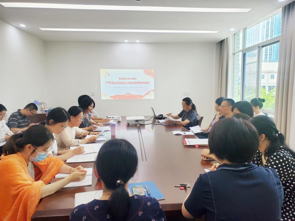 7月18日上午,公共管理学院结合党总支理论学习中心组主题教育专题学习活动,组织全体教职工开展师德师风专项学习。本次学习由学院党总支书记、院长谢程燕主持。