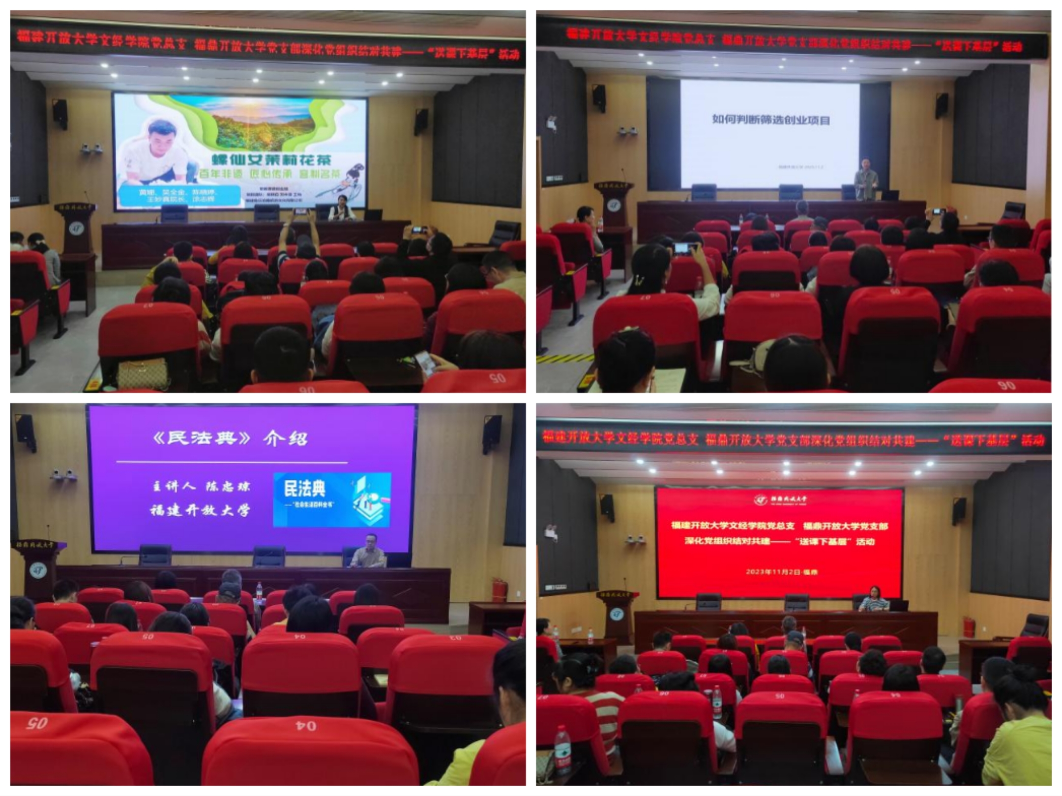 福鼎开放大学党支部是文经学院党总支开展联建联学的第一站,早在2018年双方就建立了共建关系,五年来持续不断地开展特色专业的送教送学活动。福鼎开放大学党支部书记江孝松代表全校对文经学院党总支的到来表示热烈欢迎,并介绍了福鼎开大近年来党建工作、办学业务、主要特色、取得成绩及今后转型发展的工作思路。文经学院党总支书记王妙真分享了“党建引领,‘五度’育人”党建工作品牌建设的工作经验。吴全金、涂志辉、陈忠琼和刘洪四位老师交流了《参加茉莉花茶创业大赛经验分享》《如何判断筛选创业项目》《民法典知识介绍》和《学生专业社团工作经验分享》四个讲座,内容丰富,理论与实际紧密结合,实操性强,得到一致好评,为提升开大系统教师理论水平和专业素养起到推动作用。本次深化共建活动是文经学院党总支与共建党支部深化结对共建的一次新尝试,为增强体系凝聚力,服务基层电大提供新思路。