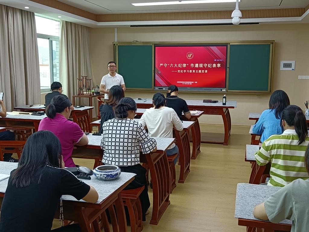 学院党总支副书记、党政管理支部书记许勇以《严守“六大纪律”,作遵规守纪的表率》为题讲授党纪学习教育专题党课。党课介绍了《中国共产党纪律处分条例》的修订意义和修订特点,全面梳理了政治纪律、组织纪律、廉洁纪律、群众纪律、工作纪律、生活纪律的学习重点,并结合学院实际对开展好党纪学习教育提出三个方面要求:一是在学习方面抓好落实,切实学深悟透;二是要从思想方面抓落实,切实真心践行;三是要从执纪方面抓落实,切实违纪必究。要坚持底线思维,敬畏纪律,防微杜渐,争当讲纪律、守规矩的表率,在建设有特色高质量福建开放大学的征途中展现新作为。