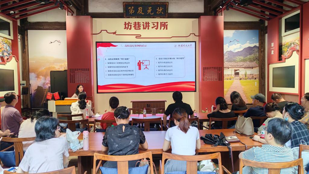 坚持师生联动学,丰富学习形式。开展党纪学习教育就是要引导党员师生真正把纪律规矩转化为政治自觉、思想自觉、行动自觉。文经学院党总支发挥专业学院优势,推动师生联学,提升学习效果。组织师生党员走进沉浸式集中性纪律教育新课堂坊巷讲习所,加深对六项纪律的准确理解把握;参观三坊七巷消防救援站,树牢遵规守纪和国家安全意识;在书法学专业师生中开展“写廉入心”微课程,组织师生手抄廉洁警句,将廉洁文化融入课堂教学和实践活动中。在学校党委举行的党纪学习教育知识竞赛中,学院党总支全体党员全部参与,10名党员跻身排名前50,在学校基层党组织中名列前茅。