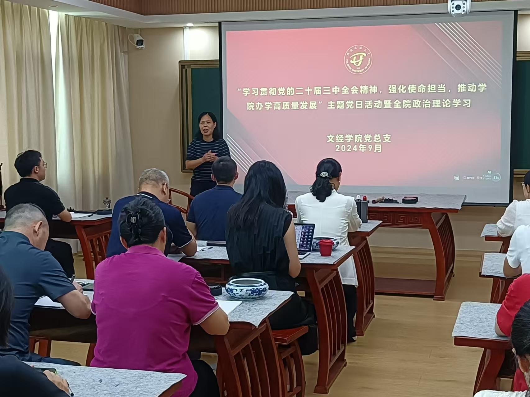 在第40个教师节来临之际,为深入学习贯彻党的二十届三中全会精神,强化教职工使命担当,进一步推动学院办学高质量发展,9月10日,文经学院党总支组织开展“弘扬教育家精神,推动学院办学高质量发展”庆祝第40个教师节主题党日活动。学院全体教职工参加。