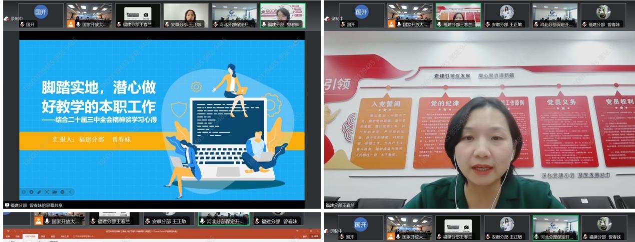 活动中,安徽分部文法与教育学院教师党支部、河北分部保定开放大学第二党支部的青年教师代表也交流了在教育改革发展的经验和体会。