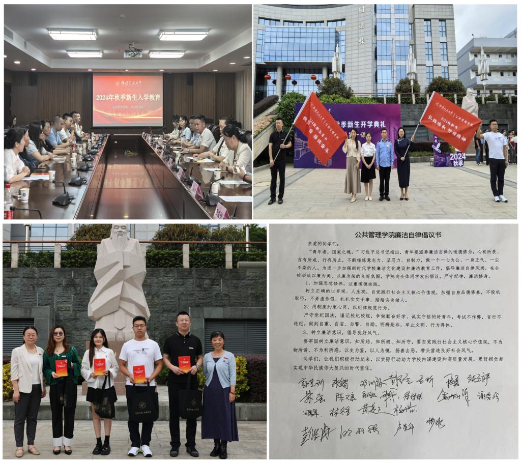 以融润廉,丰富“清风课堂”载体。学院党总支利用多种载体,依托各类活动,推动廉洁文化纵深发展,在师生中厚植润廉倡廉土壤。教师党支部积极参加国家开放大学教育学院党支部“教育改革促发展 立德树人献青春”联学共建主题党日活动,深入学习党的二十届三中全会精神和习近平总书记在全国教育大会上的重要讲话精神,分享交流开放教育立德树人故事。教职工政治理论学习研讨中,学院青年教师、全省办学体系“师德标兵”郭淑贞结合《社会保障基础》课程教学及专业研究分享将廉洁文化、纪法教育融入课堂、融于实践的教学经验,引导教师将廉洁教育内化为思政育人的重要内容。2024年秋季新生入学教育中,学院积极融入勤廉文化,邀请劳模学员为新生授旗,组织新生签署《公共管理学院廉洁自律倡议书》,推动勤廉文化“薪火传承”,帮助新生扣好人生“第一粒扣子”,树立清廉正身、勤廉尚学的人生观、价值观。