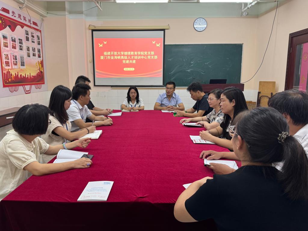 活动首站,党支部与合作办学点厦门市金海峡高级人才培训中心党支部开展党建共建座谈。双方围绕党建与业务融合、教学管理、服务提升等方面进行了深入交流。双方一致认为,要以党建为引领,共同开展党群活动,提升服务效能,把党建互促互进的政治优势转化为推动办学业务高质量发展的组织优势,努力克服当前招生办学面临的难题,构建互带互动、优势互补、共同发展的党建与办学协同新格局。