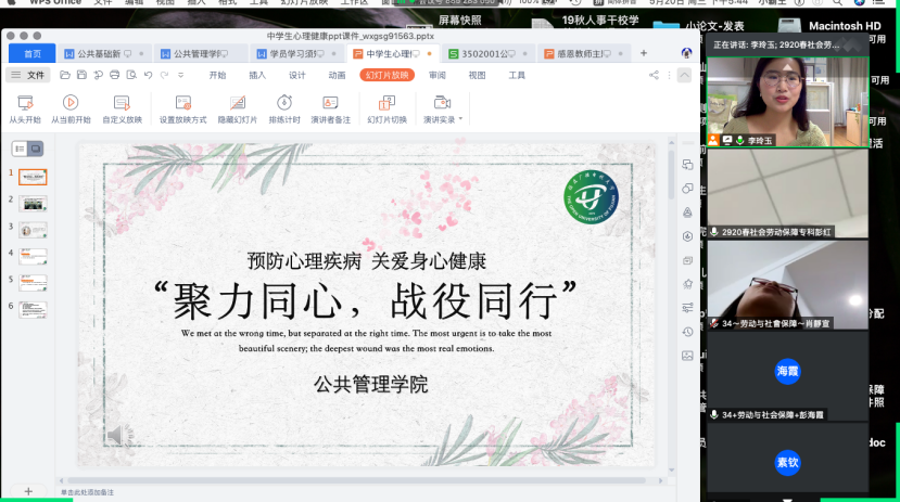 “疫情期间如何保持心理健康?”公共事业与教育系赵容副教授为大家带来了《劳动心理学》系列讲座,为正在参与抗疫工作的同学们开出心理处方。这一系列讲座增强了学生们在疫情期间的自我保护意识,进一步引导大家树立科学的心理健康理念,提高了心理健康水平。