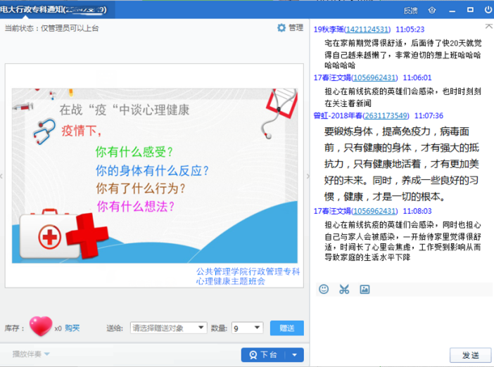 在心理健康教育月期间,公共管理学院各专业开展了“聚力同心,战役同行”心理健康教育主题“云”班会。各班通过QQ群、腾讯会议等多种线上会议形式,以疫情防控期间大学生心理健康教育为主要内容,采用问答、分享、沙龙等多种方式,引导同学们积极乐观地对待疫情;通过集体讨论,传递美好和信心;通过视频资料分享,个人感言等形式,让心理健康走进班级。