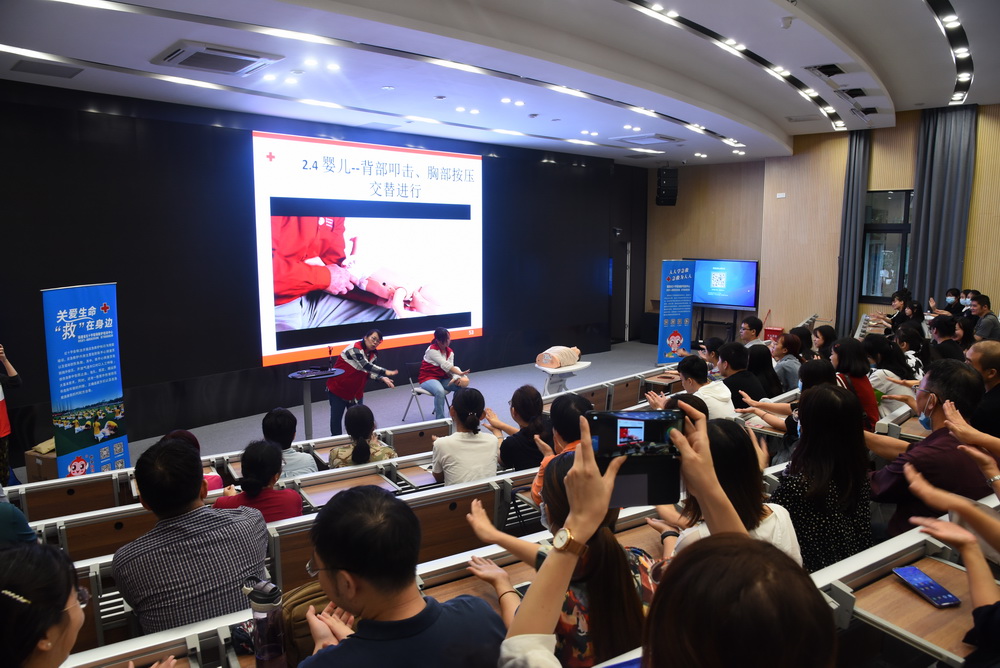 培训现场,省红十字会救护师资刘丽琴老师就现场心肺复苏术及气道异物梗塞现场急救、自动体外除颤器(AED)的使用方法,常见急症、意外伤害、突发事件的处置等内容,以互动的形式进行了现场讲解;参训学员在老师的指导下,现场操作了人工呼吸和心肺复苏的操作方法,以及成人和婴幼儿气道异物梗阻处理的技能演练。省红十字会现场应急救护中心还发放了安全救护手册,使“人人学急救、急救为人人”的生命健康教育理念在校园内进一步得到宣传推广。