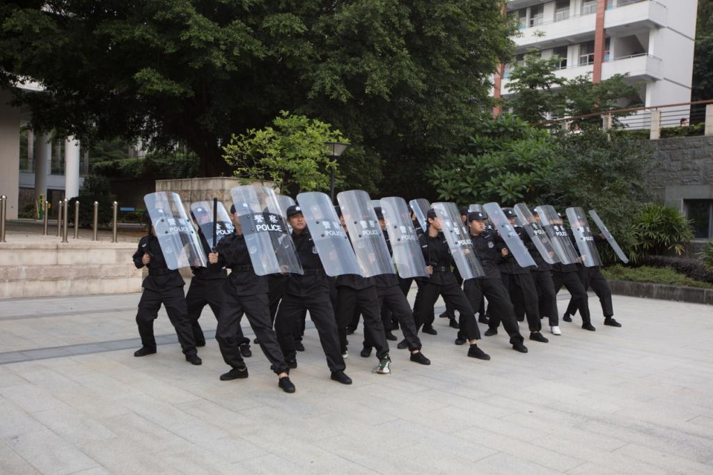 演练活动共分为两个科目的展示,科目一由应急分队进行盾牌操演练,科目二为模拟遇袭处置演练,主要模拟多名恐怖分子企图冲击校园,生活教师与学校安保人员一起合力将进入校园的歹徒制服处置过程。