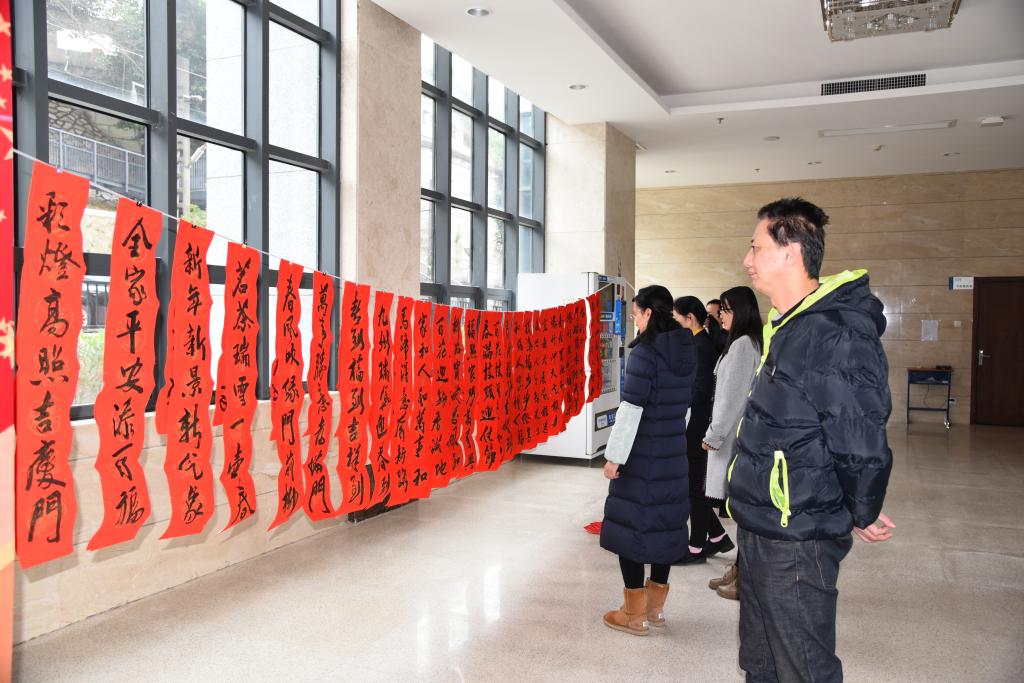 活动现场,书画兴趣小组的骨干成员挥毫泼墨,500多幅红纸为底,黑墨为字,的精彩作品既有挥别鼠年、喜迎牛年、辞旧迎新的美好愿景,也有平安吉祥、和谐发展的励志高歌。教职工们纷纷到现场观摩,他们看着一幅幅用篆书、隶书、楷书、魏碑、行书书写的春联,喜庆满脸。争相邀请书法老师为自己写上一幅满意的春联和福字,有不少教职工还要求为他们书写特定春联准备带回老家张贴迎福,希望自己在新的一年里有新的气象。