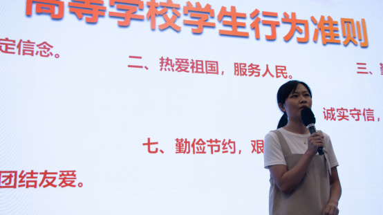 活动中,辅导员王真真首先从《高等学校学生行为准则》主要内容及其重要意义等方面展开论述。紧接着,辅导员熊晟罡以大学生为案例,通过紧贴日常生活的事例引导学生发现身边问题,重视身边不良行为,使学生们认识到学习准则的重要性以及遵守准则的必要性。最后,辅导员蔡慧雄号召同学们在今后的学习生活中提高纪律意识、自查自纠、增强自身约束力、树立正确观念,共创和谐文明的校园。