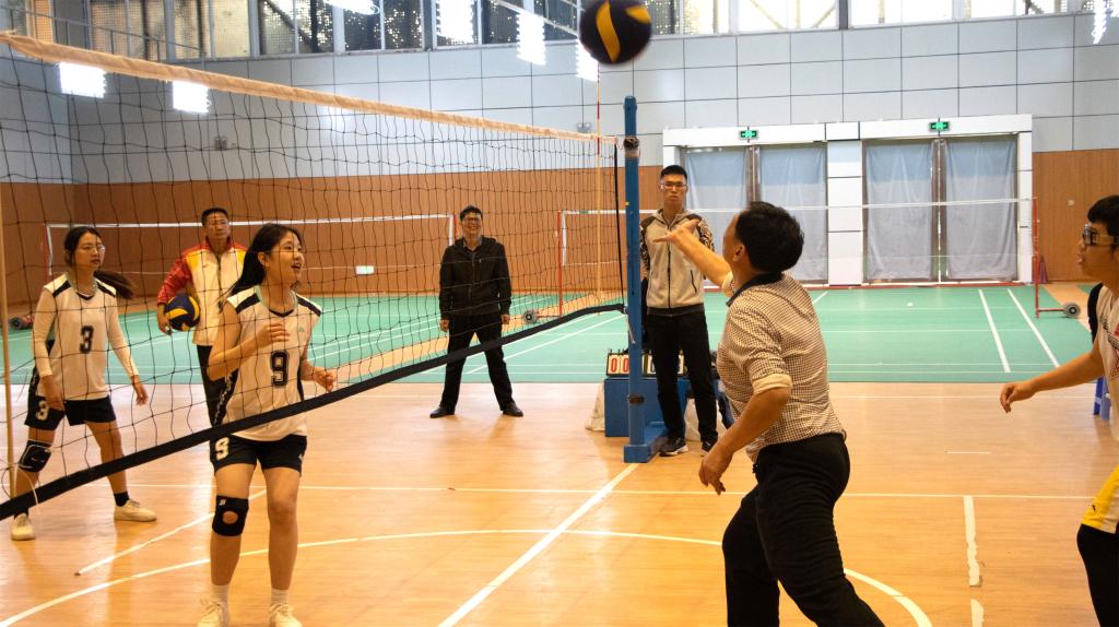 12月14日下午,校纪委书记王幼新到桂山校区体育馆,开展联系学生社团活动,为即将出征福建省第一届中等职业学校学生气排球比赛的校女子气排球队员鼓劲加油,并组织纪检干部与参赛队员开展热身赛。