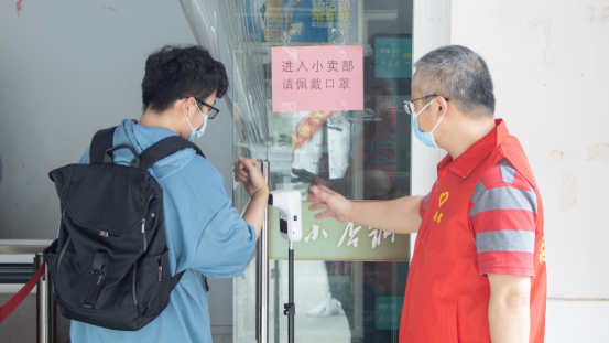 除人群最为集中的食堂外,校园内的其他地方也随处可见防控志愿者们的身影。学校大门口站岗的志愿者们配合安保人员,对入校人员进行身份核验、二码(健康码和行程码)核查和体温检测,严格做到逢人必检、逢车必查;学生服务中心值班的志愿者们严格对进入人员进行登记,并要求佩戴好口罩方可入内;校园小卖部的志愿者劝导同学们佩戴口罩入内购物,等候结算期间排队间隔1米;校园巡逻志愿者们在午间与下午下课后跟随老师巡查各地,提醒同学们带好口罩,少点外卖,拿取快递要消杀。