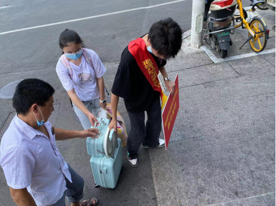 8月23日上午7:30,所有志愿者整装集合。火车站的学生志愿者们在老师的带领下,高举迎新牌迎接出站的新同学,在确认新生身份、测量体温后,志愿者们便安排新生及陪同的家长坐上开往学校的大巴。与此同时,驻守校内的志愿者们也在如火如荼地进行着志愿服务工作:提供新生咨询、引导新生报到、引领入住寝室和帮忙搬运行李等。