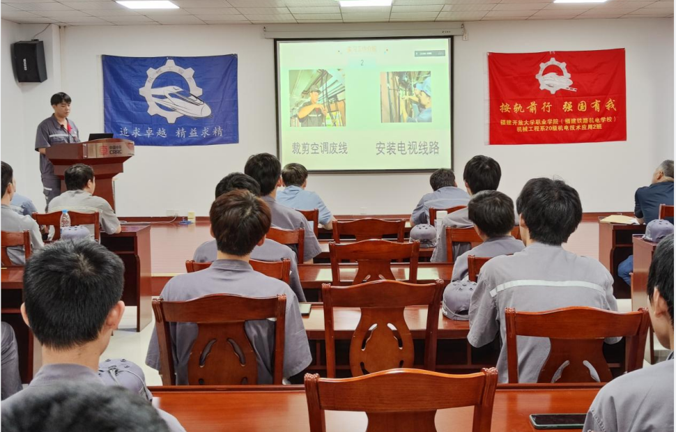 汇报会上,学院原11TG3班毕业生谢焕发代表在公司工作的往届毕业生首先发言,向20级的学弟们介绍了自己在公司发展成长的历程,并真诚表达了对学校、公司培育的感激与对学弟们的期望之情。紧接着,20JD1班5个班组代表依次上台进行实习中期汇报,同学们的汇报PPT图文并茂,他们用朴实、精炼的言语,总结了小组实习的情况和收获,展示出在不同岗位的实习风采。班主任李文娟通过腾讯会议以视频的方式与同学们进行了交流互动。
