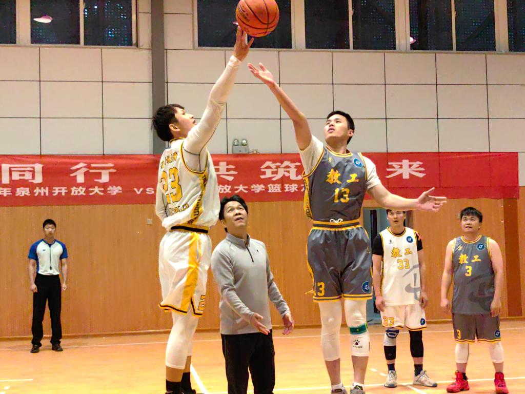 正值2023年教职工趣味运动会举行之际,12月21日下午,学校教工篮球队与泉州开放大学教工篮球队在校体育馆为大家献上一场精彩的友谊赛,为趣味运动营造气氛,增添热度。党委书记庄莉,校长吴国荣,党委副书记、工会主席马成斌现场观看比赛,并慰问队员。吴国荣为比赛开球。