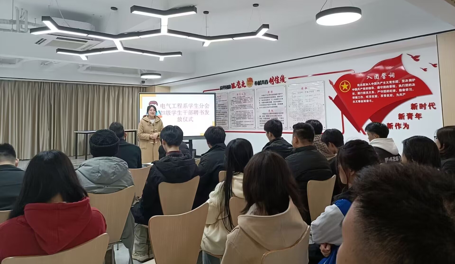 1月4日晚,职业学院电气系在尚智楼一楼学生服务中心开展学生分会换届竞选大会及2021级学生干部聘书颁发仪式。学院电气系党支部书记赖海昌、团总支书记陈龙,电气系学生分会全体成员参加会议。