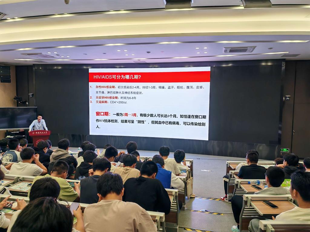 讲座由晋安区疾病预防控制中心的阮宏锦和邢知两位专家主讲。讲座上,专家向2024级新生普及艾滋病的传播途径、流行概况,并通过案例分享阐述艾滋病对青少年群体可能产生的深远影响,凸显了问题的严峻性与紧迫性。此外,主讲专家从艾滋病的危害与临床表现切入,着重介绍艾滋病预防措施与治疗手段,强调了加强自我保护的重要性,提醒青少年群体在学习与日常生活中应自尊自爱,严于律己,倡导正常的社交互动,远离一切可能带来风险的行为。讲座最后,为了巩固讲座效果,疾控中心工作人员向在场学生们发放了防艾知识问卷,培训整体反馈情况良好。