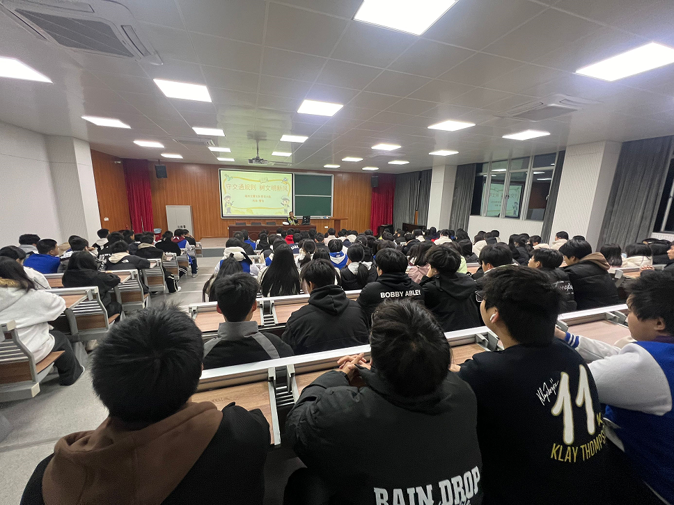 为增强学生交通安全意识,培养文明出行习惯,12月26日下午,学院邀请福州市交警支队晋安大队肖涛警官到校,开展“守交通规则,树文明新风”为主题的交通安全讲座。学院共有110名师生参与。