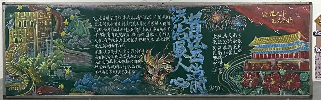 活动期间,各系各班级积极响应,精心策划。围绕宪法主题,深入挖掘宪法精神与法治观念,通过创意十足的设计与生动的表现形式,将宪法标语、法治故事、法律小知识等内容巧妙融入黑板报作品中。经过激烈角逐,评委组从作品的主题契合度、创意构思、视觉呈现等多个维度进行了严格把关与细致考量,最终6个班级脱颖而出:24JY1(一等奖);23TX1、23YS1(二等奖);23DZ2、23CL1、23JD2(三等奖)。