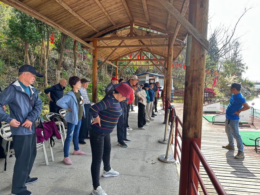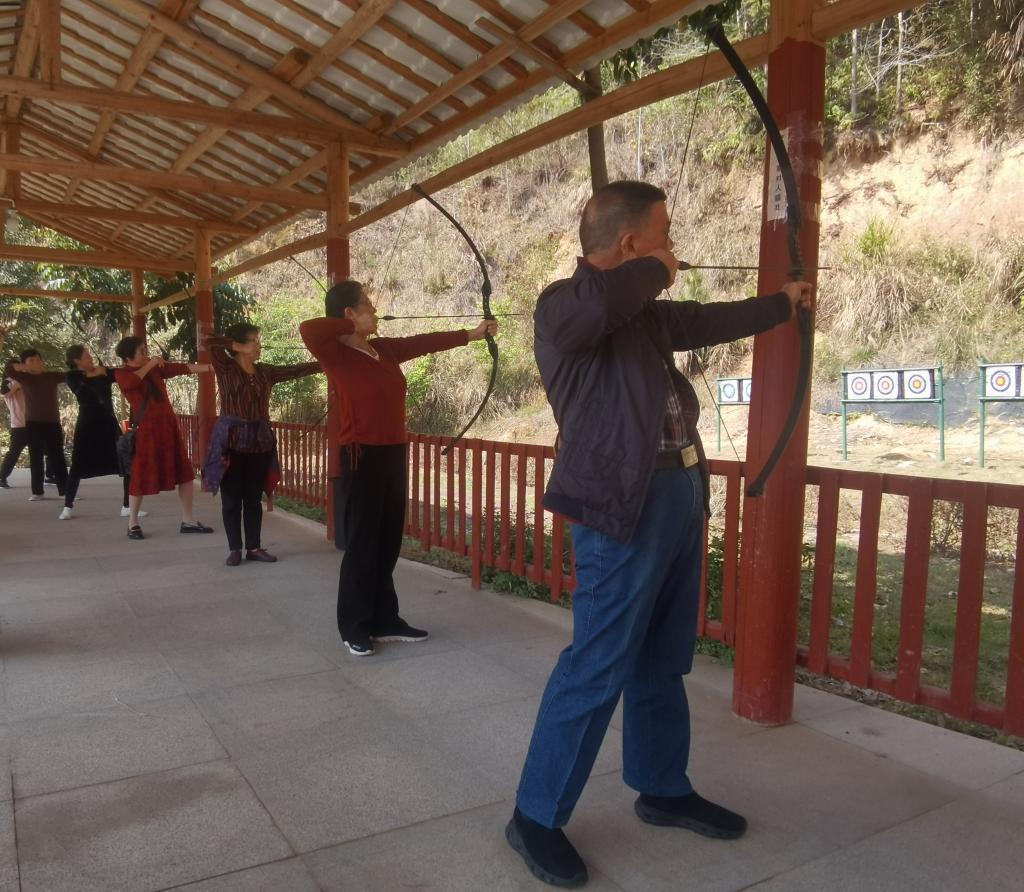在幸福庄园,漫步在山水成荫的美好自然环境中,大家分成三组,先后参观了新时代法治教育实践基地,参加了水上高尔夫、制作葱饼、射箭、打牌、茶叙等活动,清新的空气与明媚的阳光让大家心情愉悦,现场满是欢笑声与喝彩声。在法治教育实践基地,大家学习习近平法治思想,增强了法治意识和防范诈骗、保护自我的能力。在水上高尔夫区域,他们身姿矫健,挥动球杆,白球掠过水面,激起层层涟漪。手工制作葱饼的环节更是充满乐趣,老同志们围坐一起,在庄园师傅指导下揉面团、包馅料、擀面皮,一道道工序有序进行,当喷香的葱饼新鲜出炉,大家品尝着自己的劳动成果,脸上洋溢着幸福与开心。射箭场上,老同志们同样不甘落后,他们搭箭、拉弓,眼神专注,尽显沉稳自信,即便是初次尝试的,在工作人员耐心指导下,也能射中目标,体验到射箭的独特魅力。在棋牌室,老干部或打牌,或打台球,或泡茶交流,其乐融融。