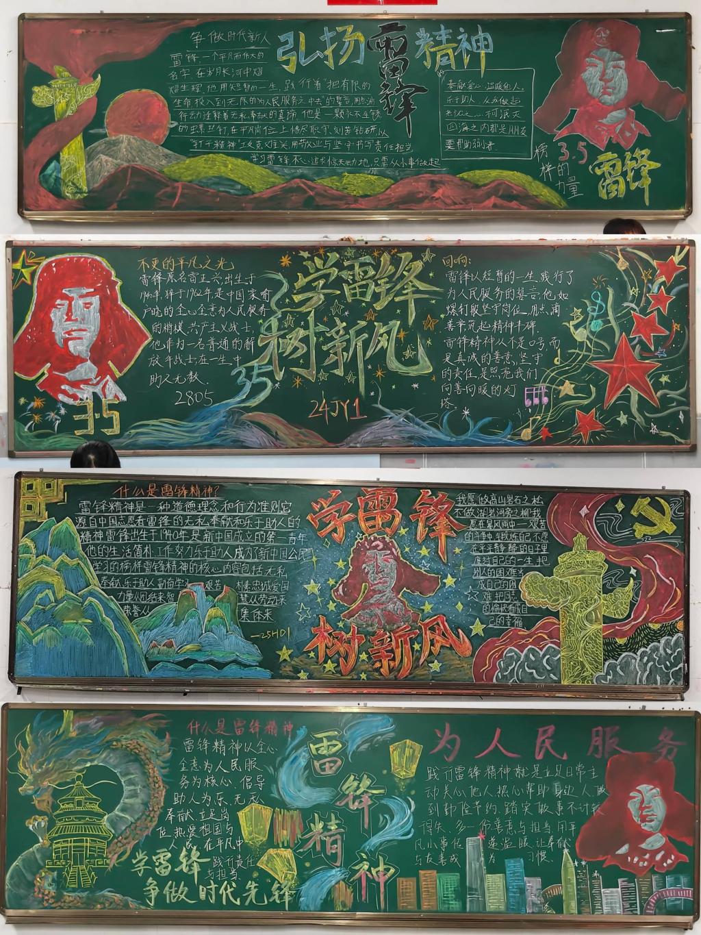 三月的校园里,各班级的学雷锋主题黑板报成为了校园里一道亮眼的风景。同学们以黑板报为创作阵地,用图文结合的方式呈现雷锋的生平故事、经典名言,解读雷锋精神的新内涵,探讨雷锋精神在当下的传承与实践。让同学们把雷锋精神融入日常学习和生活的点滴之中。