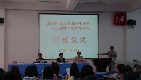 为贯彻落实福建省人民政府《关于进一步加强中小学教师队伍建设的意见》的文件精神,有效地提高农村中小学骨干教师的教育教学能力,促进骨干教师专业化成长,全面提升教育教学质量。6月15日上午由连江县教师进修学校和福建省中小学教师远程培训中心联合举办的“2015连江县农村中小学骨干教师培训班”在连江县教师进修学校学术报告厅举行开班仪式。福建电大教师远程教育学院院长徐敏,连江县教育局人事科科长叶功鹏,连江县教师进修学校副校长曾凡忠、培训处副主任陈为镜及全体学员出席了开班仪式,仪式由陈为镜主持。