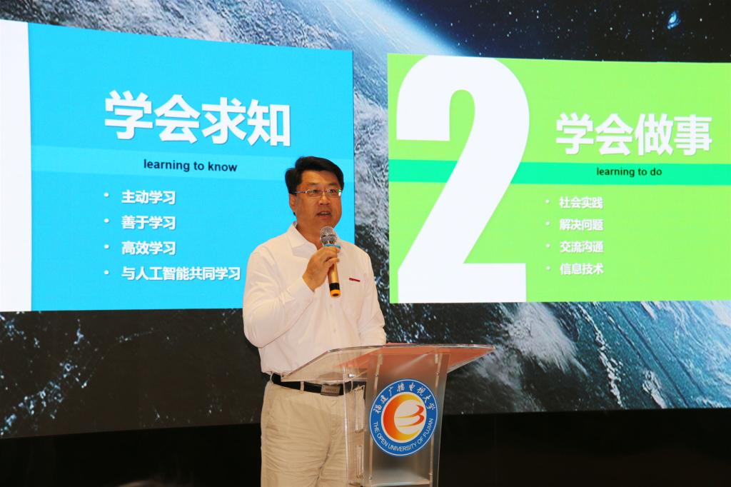 陈展虹代表学校向新同学的到来表示热烈的欢迎。他表示,“服务社会、报效祖国”的家国情怀始终贯穿福建电大的办学历史,学校建校40年来一直秉承“以人为本、开放包容、协同创新、服务社会”的办学理念,面向基层、面向农村、面向边远地区办学,培养出了全国三八红旗手、时代楷模黄志丽,全国优秀士官人才奖获得者刘灿华等先进模范,为改革开放、为经济社会发展作出了巨大的贡献。陈展虹寄语广大学生,要不忘初心,继续前行,把个人发展融入到民族复兴的伟大事业当中,积极贡献电大人的力量,展现电大人的担当作为。