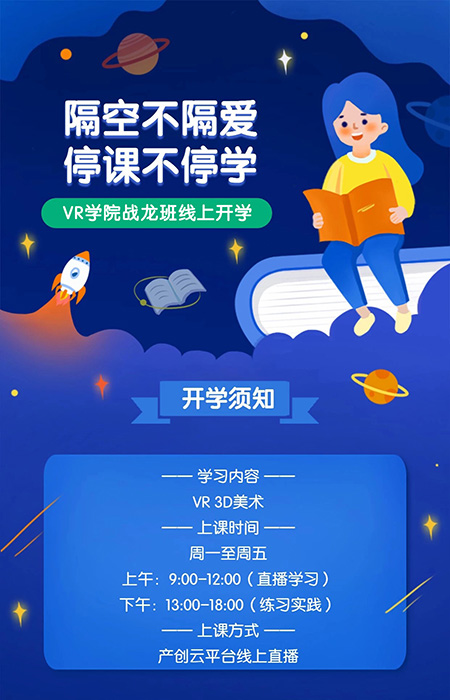 面对突如其来的疫情,为认真贯彻落实上级主管部门和校党委关于疫情期间“停课不停学”精神,VR学院充分利用“网龙产创云”网络学习平台,于2月24日起开展线上教学,学生通过登录平台签到进行学习,并完成老师在平台上布置的相应学习任务。