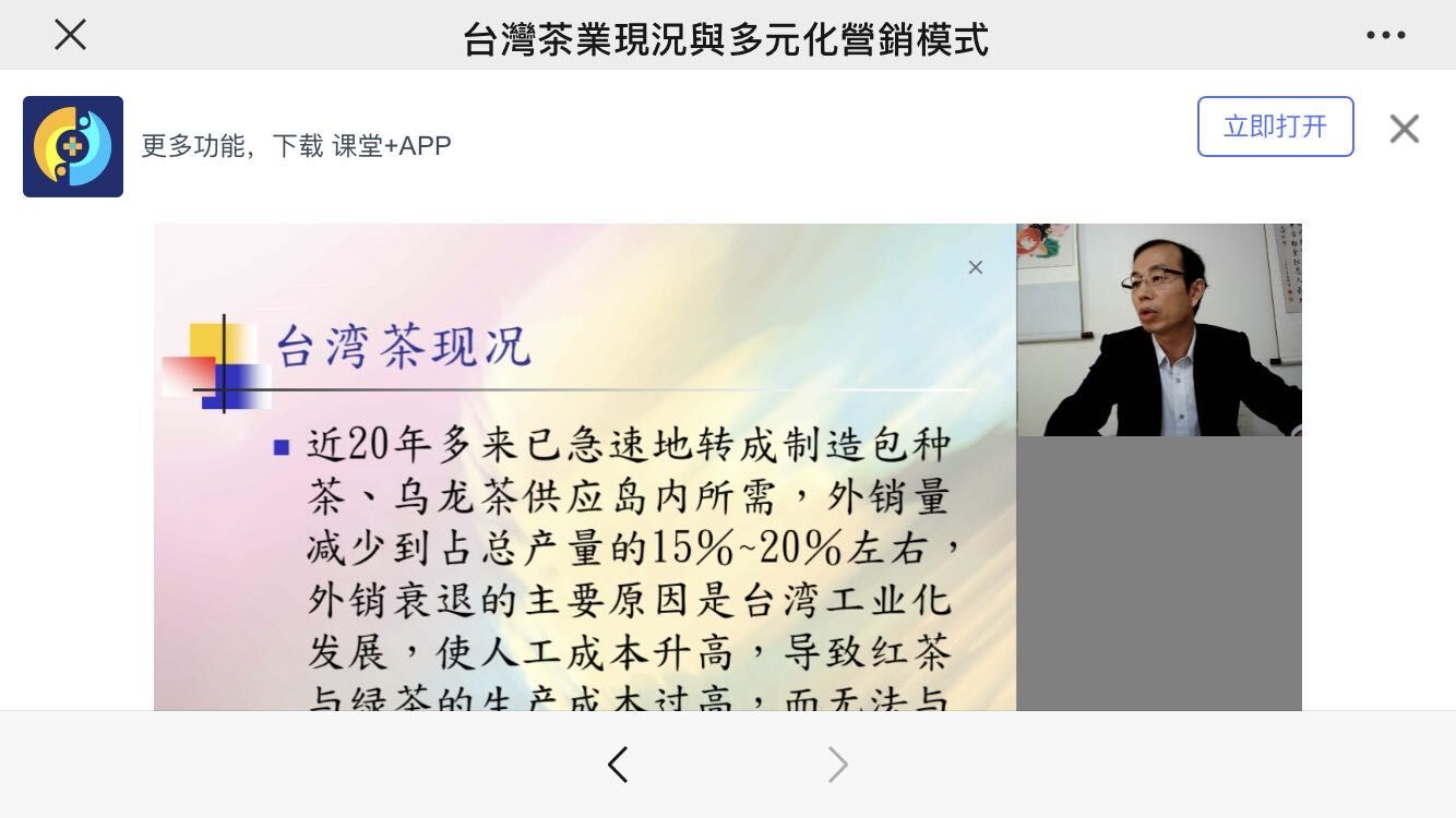 练卜鸣的远程直播课以《台湾的茶叶现况与多元化营销模式》为题,系统地介绍了台湾的茶叶市场及营销情况、营销模式,台湾岛内十大茗茶的种植区域、制作过程以及各品牌的外形、汤色、香味、喉韵等基本特征,同时围绕市场营销,阐释了市场区隔、目标市场、市场定位等重要慨念,提出了他山之石、体验式营销、顾客价值等营销策略。结合自己的茶旅实践,畅谈观感体会,积极推展大陆在会展、电商等方面的营销路径。这场跨越海峡的直播课内容丰富,信息量大,画面清晰,过程顺畅,效果良好,受到听课师生的广泛好评。