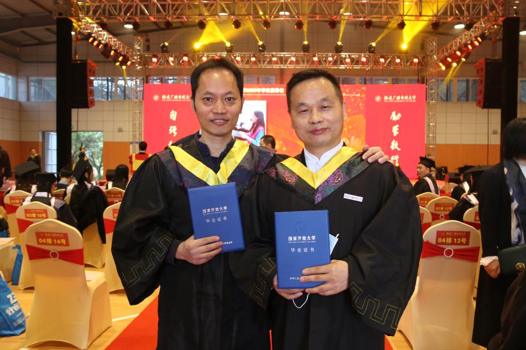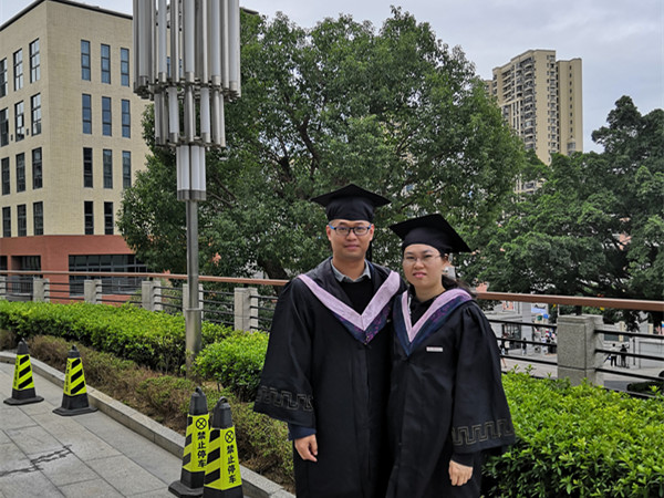 在毕业典礼现场,我们见到了兰文龙、刘伟珠夫妇。兰文龙是2018秋工商企业管理专科学生,今年专科毕业后,又在2020秋报读了工商管理本科。妻子刘伟珠是2017秋工商管理本科学生,今年毕业并申请了学士学位。让我们惊喜的是,夫妻二人一同来参加毕业典礼,兰文龙表示,自己以前从事技术岗位,因为工作调整重新报读了工商企业管理专业,学习企业管理相关知识,收获良多。他表示要以爱妻为榜样,努力读书,学以致用,争取顺利申请到学士学位,届时来参加学位授予仪式。