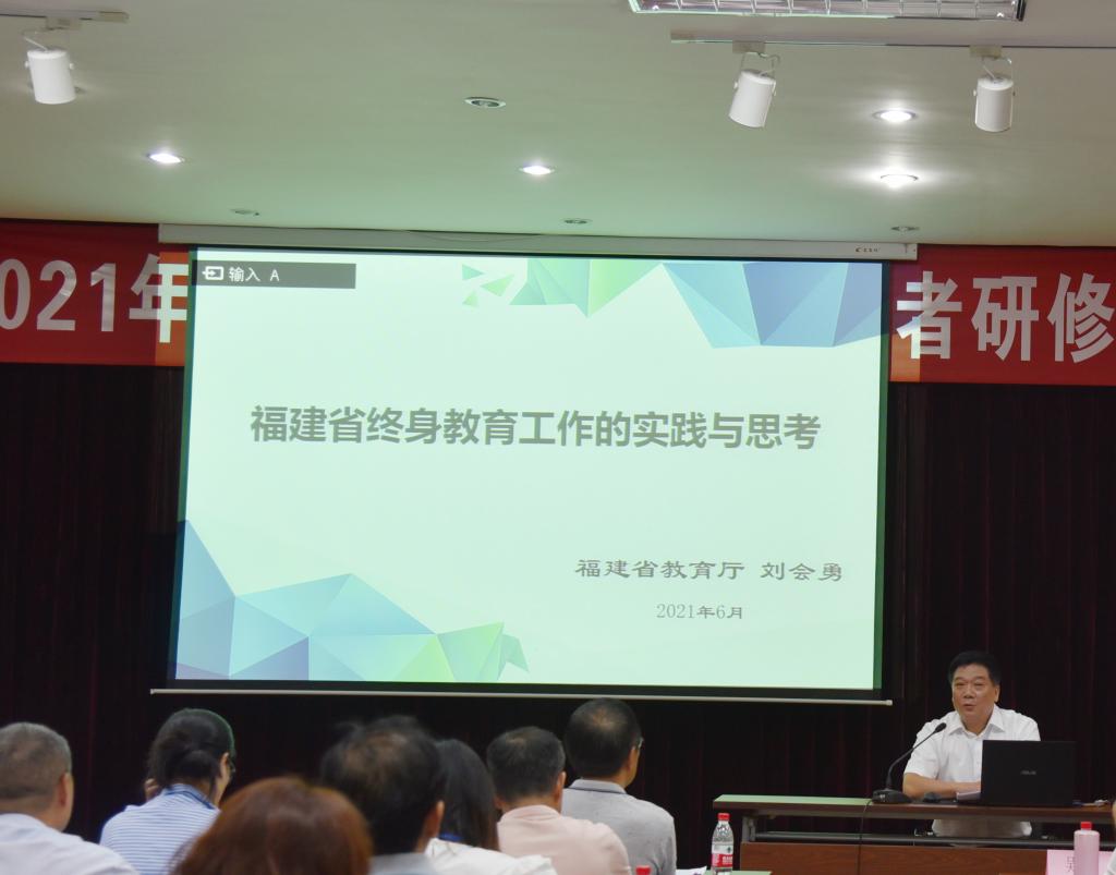 副校长沈光辉对研修班学员表示热烈欢迎,并作了首场讲座,探讨大数据下的福建省终身教育发展,他指出,大数据开启时代重大转型,可以为终身教育变革创新提供全新思维,将促进终身教育形成新模式、新业态、新生态,构建网络化、数字化、个性化、终身化的教育体系,建设“人人皆学、处处能学、时时可学”的学习型社会。