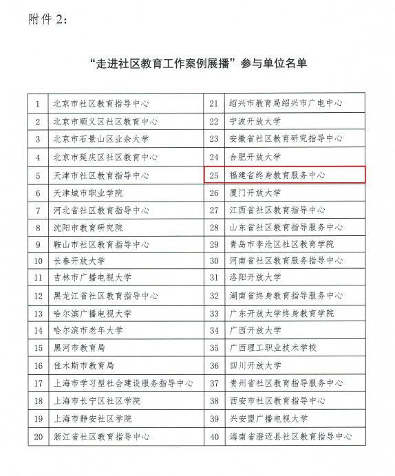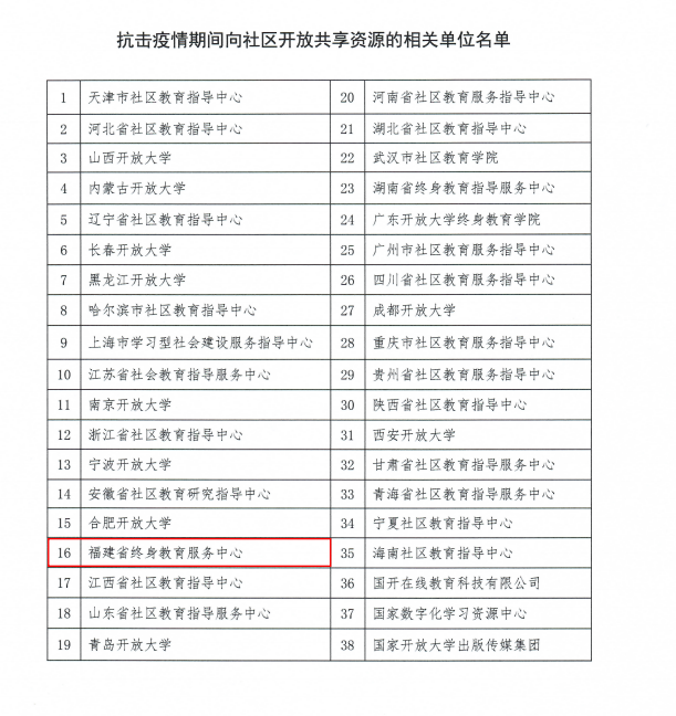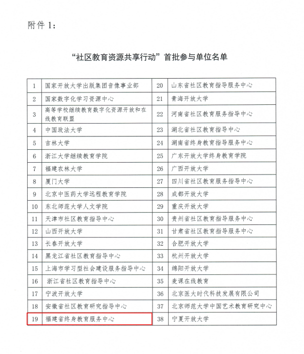2021年10月17日教育部社区教育研究培训中心公布《关于对“社区教育资源共享行动”首批参与单位、“走进社区教育”展播首批参与单位、抗击疫情期间向社区开放共享资源的相关单位的通报表扬》,福建省终身教育服务中心入选“社区教育资源共享行动”首批参与名单、“走进社区教育工作案例展播”首批参与名单和抗击疫情期间向社区开放共享资源的相关单位名单三项表扬名单。