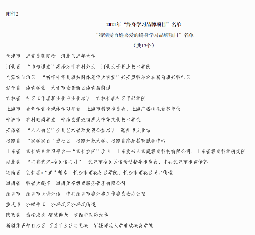 近日,中国成人教育协会受教育部办公厅和职业教育与成人教育司委托,在各地教育行政部门、成人教育协会等单位推荐基础上,经过全民终身学习活动周专家组审核和网上公示后正式发布了《关于推介2021年“百姓学习之星”和“终身学习品牌项目”的通知》(中成协[2021]040号)。福建省有5人被评为全国2021年“百姓学习之星”,5个项目被确定为全国2021年“终身学习品牌项目”,其中我校的“双学双百进社区”项目获全国2021年“特别受百姓喜爱的终身学习品牌项目”,是我省首次获得此项目。