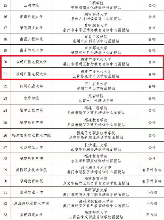 12月28日,省教育厅公布2021年高等学历继续教育教学站点评估结果,我校4个函授站评估结果均为合格。根据《福建省教育厅关于开展2021年高等学历继续教育教学站点现场评估的通知》,本次评估工作由省教育厅牵头,随机抽取50家在闽高等学历继续教育函授站点进行现场评估,我校被抽检的4个函授站为厦门市思明区智行教育培训中心、宁德鸿儒培训学校、漳州市云霄县立才培训学校、福州市仓山区典艺培训学校。