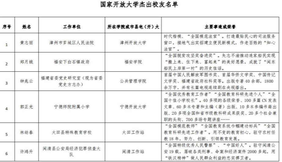 近日,国家开放大学印发《关于公布国家开放大学杰出校友、优秀校友名单的通知》,我校推荐的20位校友悉数被授予国家开放大学杰出校友、优秀校友称号。其中,国家开放大学授予黄志丽、郑月娥、钟兆云、郭正光等15位校友“国家开放大学杰出校友”称号,追授肖毅“国家开放大学杰出校友”称号,授予钟德彪、陈进富等4位校友“国家开放大学优秀校友”称号。