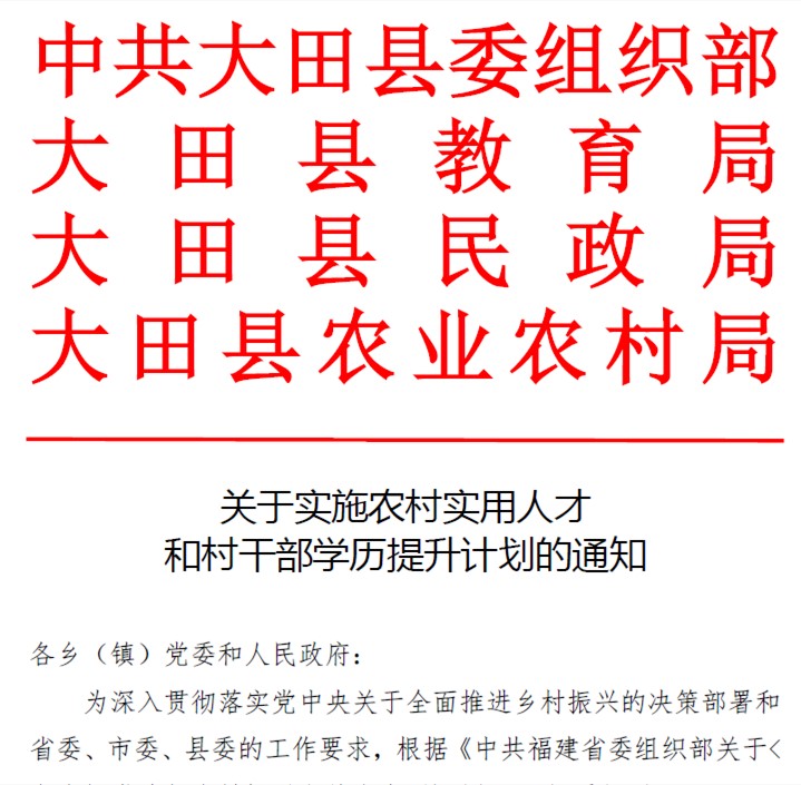 一、部门协同,服务乡村振兴战略。为培养造就一支懂农业、爱农村、爱农民的“三农”工作队伍,提高农村基层干部学历层次,县委组织部、教育局、民政局、农业农村局联合下发了《关于实施农村实用人才和村干部素质提升计划的通知》。通过调查摸底、乡(镇)党委专人负责、大田电大教师对接跟进等措施,有200余名村干部和后备干部报名参加学历提升,仅行政管理(乡村管理方向)专业就有112人。