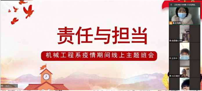 机械系组织20、21级各班于3月28日下午召开以“立足现实,责任担当”为主题的线上班会,线上班会由各班班主任主讲,全体学生参加。线上主题班会中,各班班主任充分利用在疫情防控期间涌现出来的先进事迹对学生开展思想政治教育,培育学生的爱国奉献精神。同时,加强对学生的防疫知识宣传教育,叮嘱同学们养成良好的个人卫生和生活习惯,在网课之余“下线”到操场参加体育锻炼,提高自身免疫力。