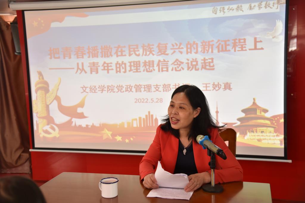 在回程的“红船”上,学院围绕“喜迎二十大,启航新征程”的主题开展了学生骨干培训。学院党总支副书记、副院长王妙真以“把青春播撒在民族复兴的新征程上”为主题,为学生网上党支部成员讲党课。王妙真从五四运动爆发讲起,带领同学们回顾了百年来青年觉醒和奋斗的历程,号召同学们接好民族复兴的接力棒,自强弘毅,励学敦行,做奋发有为的开大人。