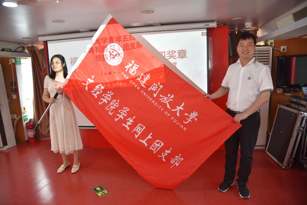 在红船上,校团委书记黄生春为首届福建开放大学青年五四奖章获得者文经学院许鸿伟、陈兴两位同学颁发证书和奖杯,并为文经学院“网上团支部”授旗。“网上团支部”成立后,将坚守“坚定不移跟党走,为党和人民奋斗”的初心使命,在学院党总支和校团委的领导下,认真做好组织青年、服务青年学生工作,为深化“12335”成人大学生思政工作模式积极开展探索实践。